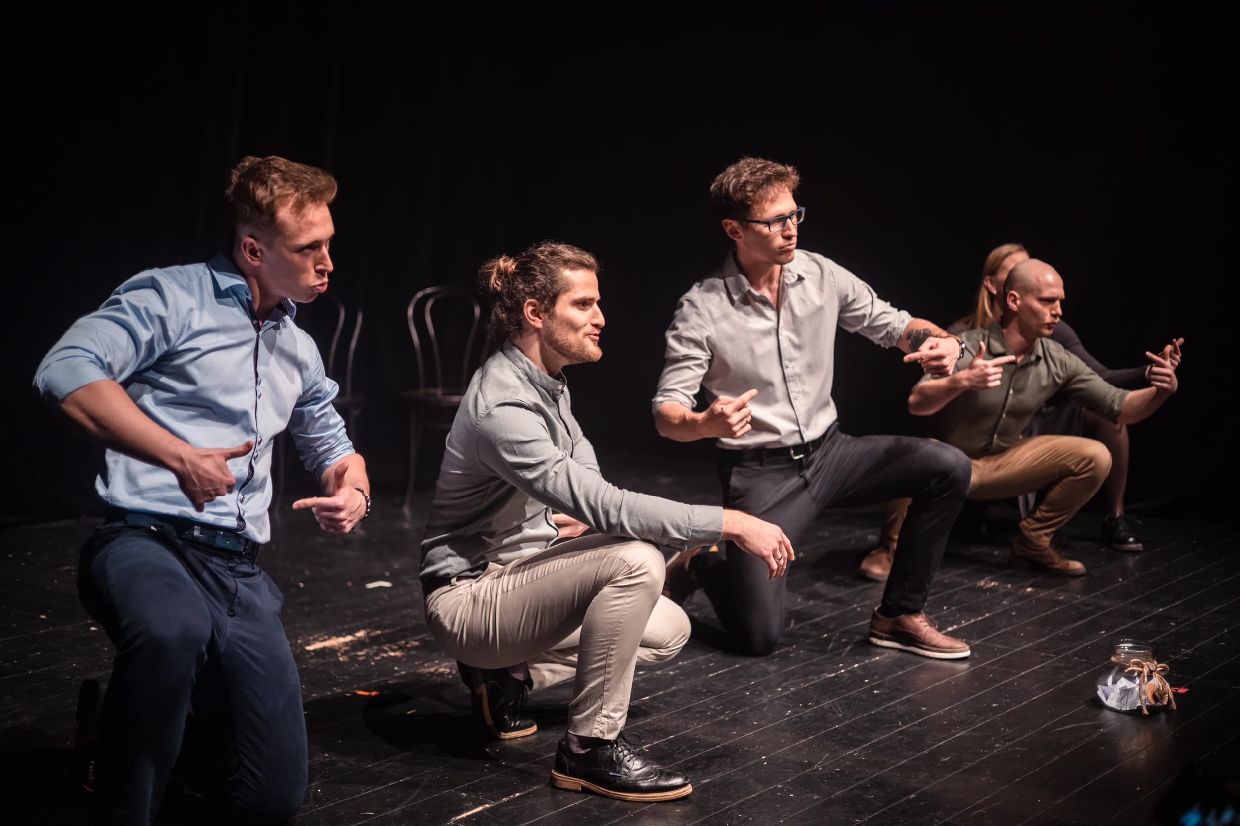 Jesteśmy improwizatorami, zawodowymi aktorami i muzykami, absolwentami Szkoły Impro Silesia, a swoje umiejętności szlifujemy z najlepszymi instruktorami z Polski, Europy, Kanady i USA.